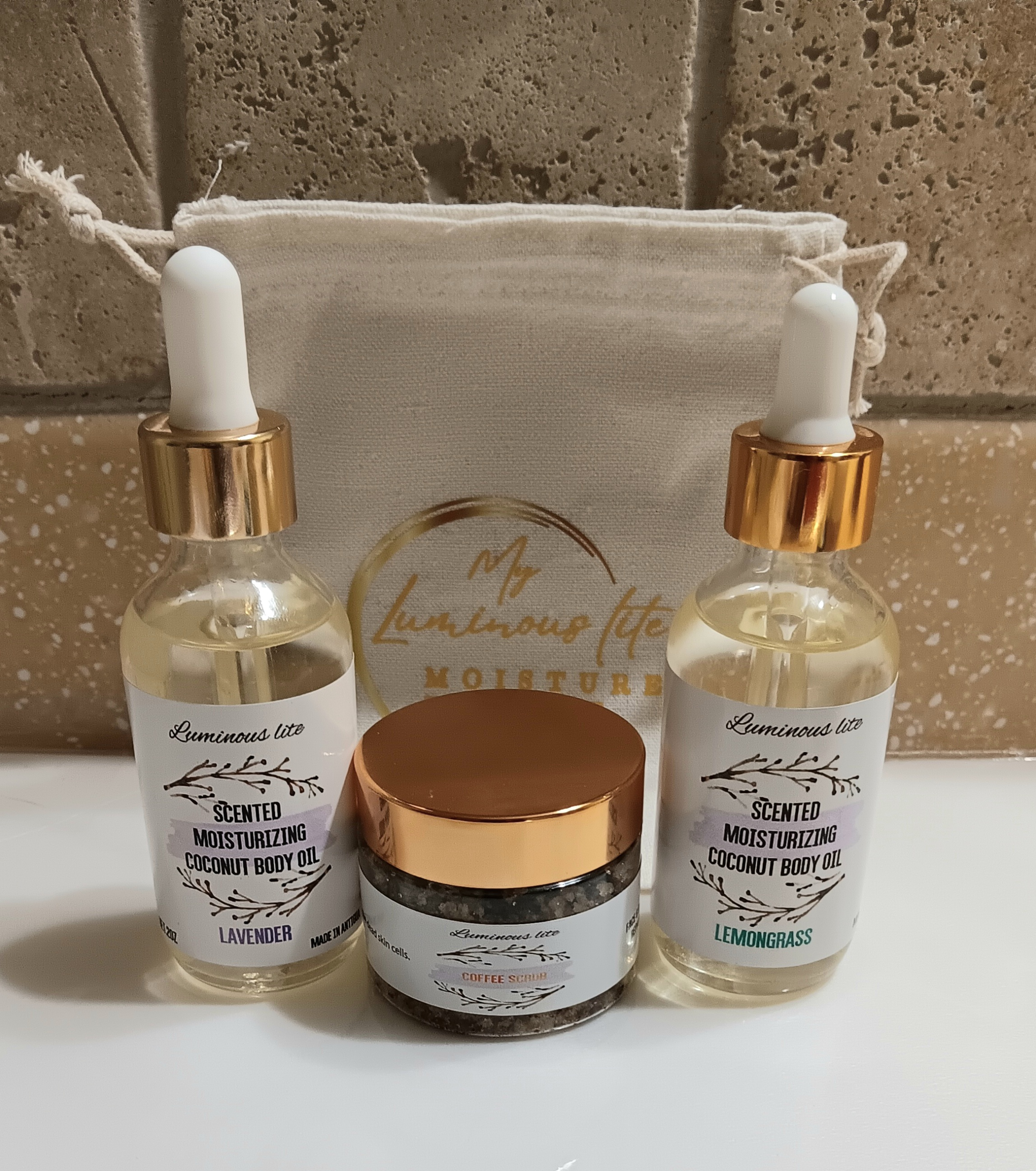 2 Scented coconut body oil, 1 2oz Coffee scrub including a moisture pouch